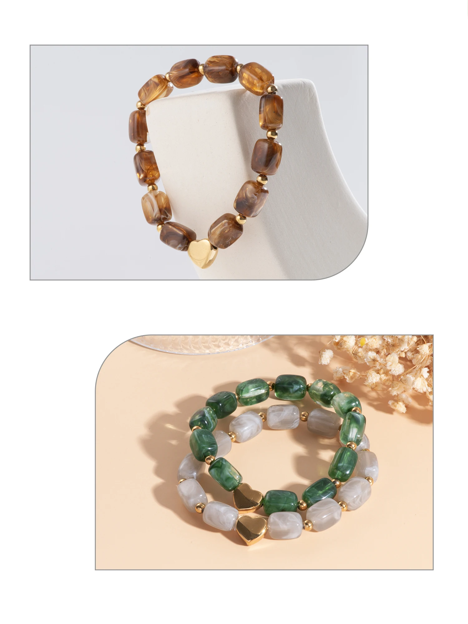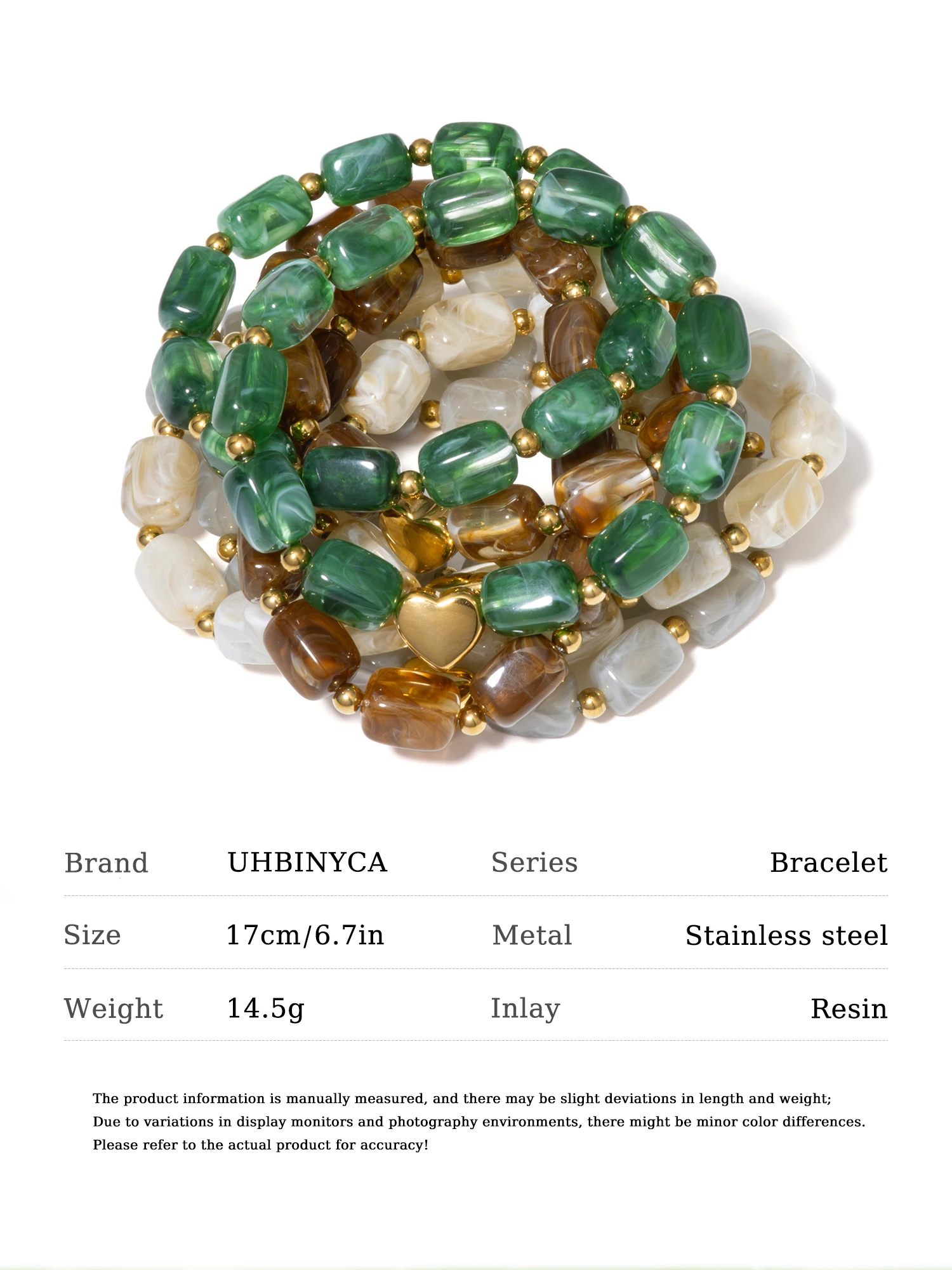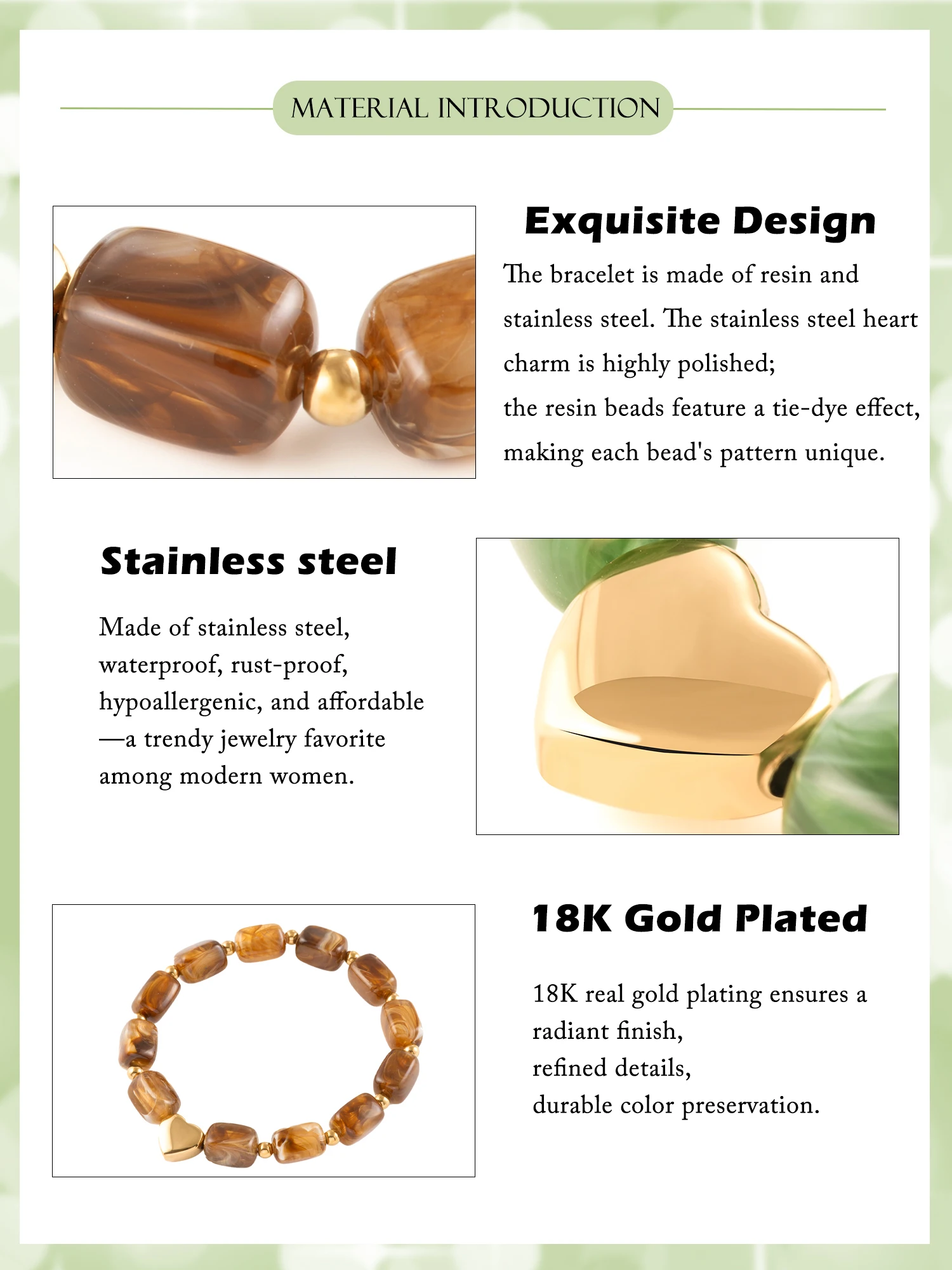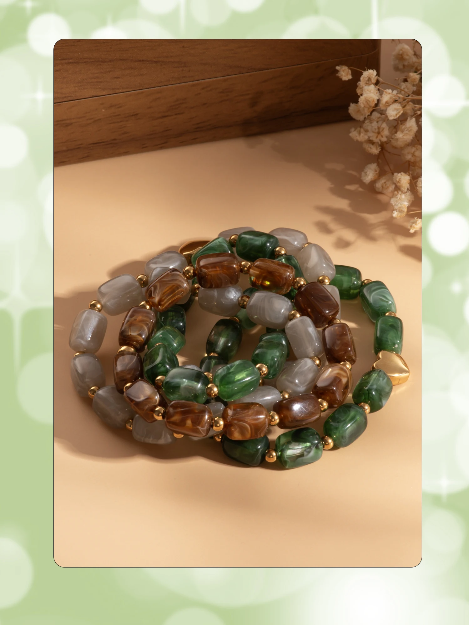 Handmade Resin Bracelet – Stainless Steel, Green/Brown/White
